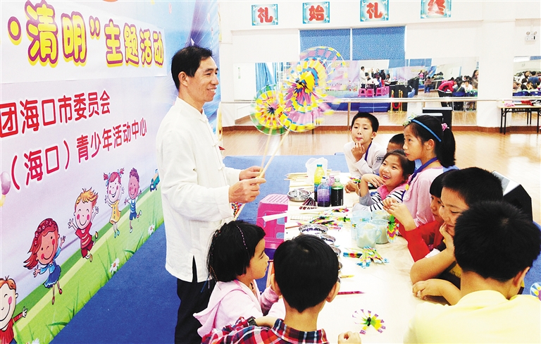 3月26日上午,在海南(海口)青少年活动中心,小朋友在老师的指导示范下学制传统风车。当天,由共青团海口市委员会主办的“我们的节日·清明”在海口举行,数十名小朋友通过体验传统手工风轮的制作,来了解、感知清明节的来历。活动同时也是为了倡导环保、低碳过清明的理念。