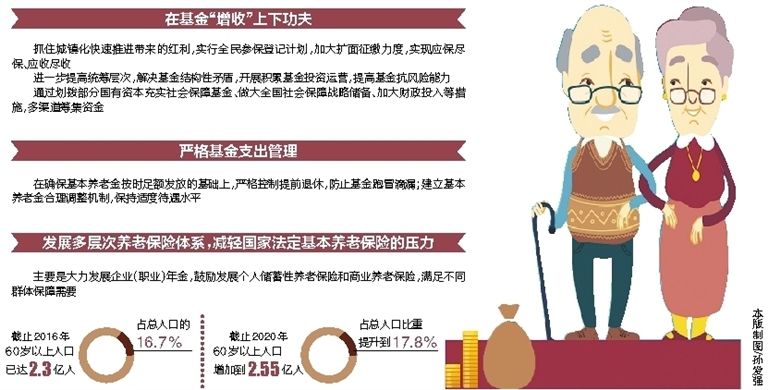 贾江表示,为及早、综合、科学应对我国人口老龄化趋势,“十三五”时期,将主要通过几项举措改革和完善养老保险制度,健全参保缴费激励约束机制,实现养老保险基金长期平衡。