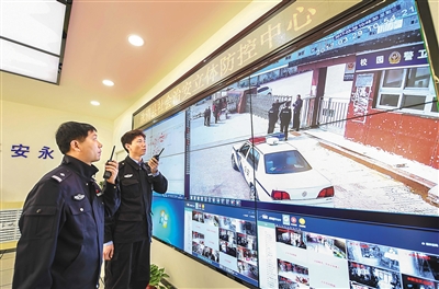 3月29日,永清县公安局巡警队员在一键式报警系统指挥中心演示案情处置。 河北省永清县公安局在城区全面推行一键式视频报警系统,构筑起全方位、立体化的城市“巡控网络”,真正实现了让群众“按个钮,就报警”。目前,此设备覆盖整个城区,实现了100个视频报警点和200多路高清视频联动。
