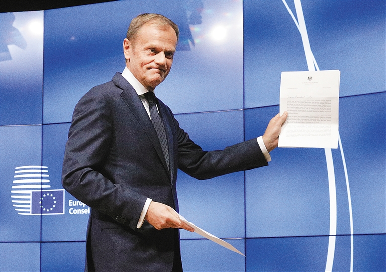 3月29日,在比利时布鲁塞尔举行的新闻发布会上,欧洲理事会主席图斯克展示收到的英国“脱欧”函。英国首相特雷莎·梅29日致函欧盟,正式开启英国“脱欧”程序。新华社/美联