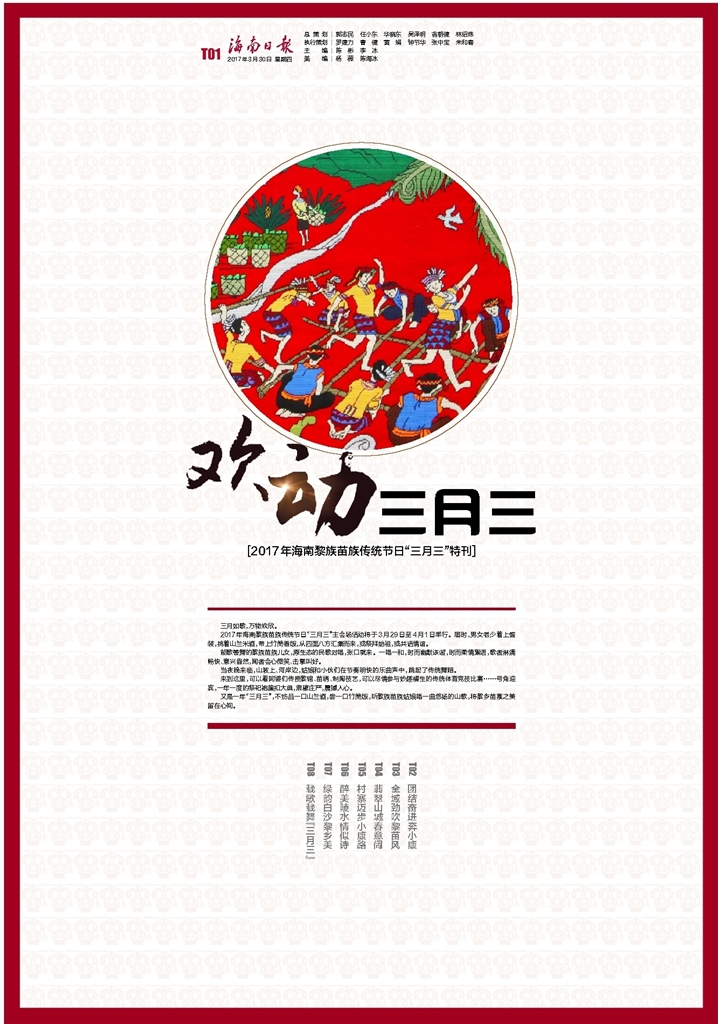 2017年海南黎族苗族传统节日“三月三”主会场活动将于3月29日至4月1日举行。届时,男女老少着上盛装,挑着山兰米酒,带上竹筒香饭,从四面八方汇集而来,或祭拜始祖,或共话情谊。