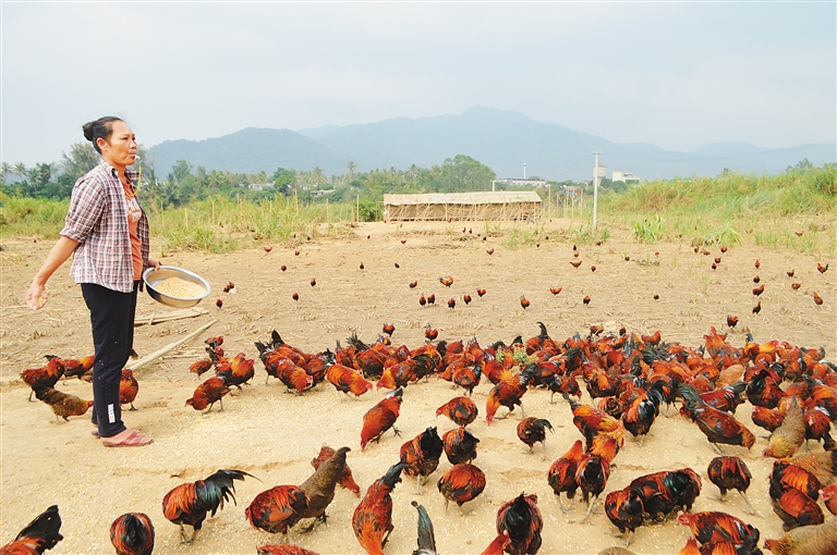 在白沙黎族自治县金波乡牙加村拉什村民小组的橡胶林旁,两间瓦房、一排猪栏、几间鸡舍,是村民陈兰妹的家,1000多只散养的山鸡,让她“养”出一片属于自己的事业。