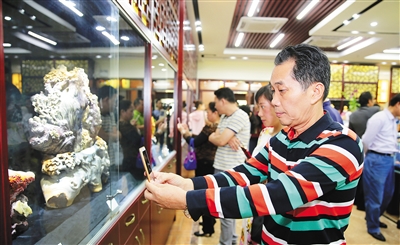3月29日,昌江黎族自治县玉艺术馆开馆,嘉宾及游客在欣赏玉石作品。该馆建筑面积1200平方米,收藏昌江玉艺术品200余件。现有国家级玉雕大师1名,省级玉雕大师1名,技师5名,学员40名。近年来,昌江依托当地丰富的玉石资源,并请来国家级工艺美术大师周金甫传授玉石雕刻技艺,打造“昌江玉”品牌,带动昌江玉石文化产业成型成势,推动旅游产业升级。本报记者 苏晓杰 特约记者 林朱辉 摄