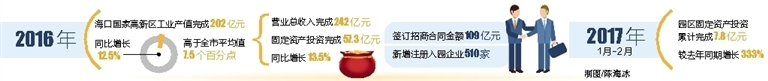 2016年,海口国家高新区工业产值完成202亿元,同比增长12.5%;今年1月-2月,园区固定资产投资累计完成7.8亿元,较去年同期增长333%……一份份不俗的成绩单,彰显出海口高新区这个“国家队”进入大发展、快发展、创新发展的新阶段。