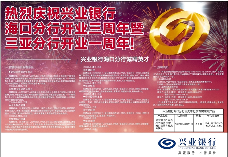 招聘标准: 35周岁以下,大专及以上学历;2年以上经济金融工作经验,具备一定的金融业务知识,从事过个人贷款业务,具有较好的风险把控能力;熟悉海南市场,心里承受能力和沟通交流能力强,对营销工作有热情和信心。拥有丰富客户资源的可适当放宽条件。