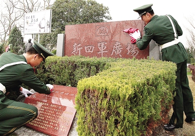 3月30日,武警上海总队二支队官兵来到上海市青浦区新四军广场,祭扫烈士陵墓。