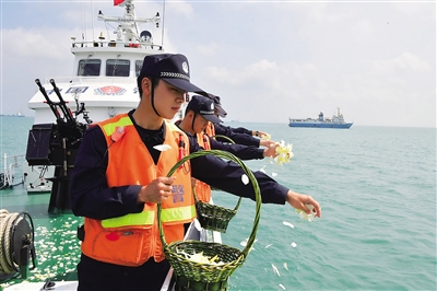 日前,海警官兵向大海洒下花瓣,寄托对革命英烈的缅怀之情。在清明节来临之际,海南海警一支队组织官兵在琼州海峡开展“海上祭英烈”活动,缅怀革命先烈,弘扬爱国精神。 本报记者 张茂 通讯员 吴意 摄