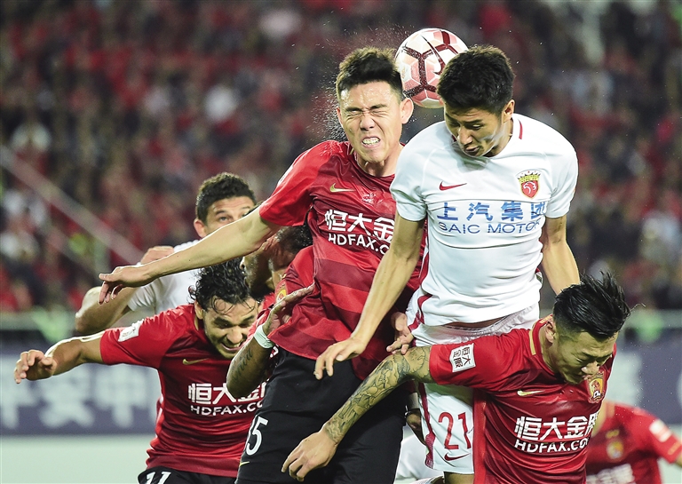 4月1日,在2017赛季中超联赛第三轮比赛中,广州恒大队主场3:2胜上海上港队。图为上海上港队球员于海(右二)在比赛中与广州恒大队球员李学鹏(右三)争顶头球。 新华社发