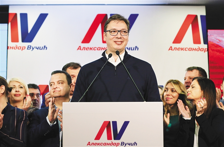 4月2日,在塞尔维亚贝尔格莱德进步党总部,塞尔维亚总理、执政党进步党主席武契奇(中)在总统选举获胜后发表讲话。 塞尔维亚总理、执政党进步党主席武契奇2日晚在进步党总部举行的新闻发布会上宣布自己在总统选举中获胜。 新华社/路透