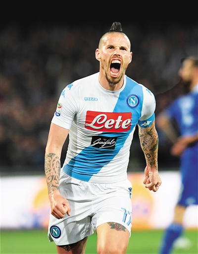北京时间4月3日,那不勒斯主场1:1逼平领头羊尤文图斯。图为那不勒斯球员哈姆西克扳平比分后庆祝。 新华社发