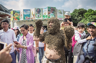 4月3日,在海口市永兴镇卓津蜜蜂王国,闻名海南的牧蜂世家传人、年过七旬的海南卓津蜂业有限公司董事长陈昌卓为游客现场表演“人蜂相戏,光身爬蜂”。陈昌卓与蜜蜂“相依为命”53年,在追花酿密生涯中,他与蜜蜂相伴相戏,并以此为乐,人称“蜜蜂人”。