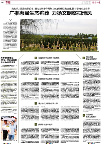 ——殡葬改革力度加大,制度建设步伐加快。各级财政加大资金投入力度,全力推进殡葬改革,省政府先后在海口、东方、万宁等市县开展了试点工作,并通过组织召开现场会,学习推广试点地区的先进经验。省委、省政府联合出台了《关于深入推进殡葬改革的实施意见》,省政府对《海南省殡葬管理办法》进行了修订,省民政厅先后出台《海南省治理“乱埋乱葬”工作方案》《关于加快推进公益性公墓建设的通知》《关于开展惠民殡葬试点工作的通知》等文件,殡葬管理制度建设逐步完善。