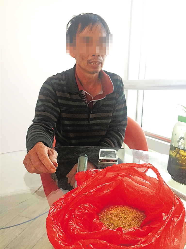 3月24日,一名自称“李主任”的年轻男子在红旗镇街边“偶遇”老丁,称可以和他一起弄胡椒苗生意,约他过几天到海口细谈。3月30日,老丁和“李主任”在海口见了面,“可见了面他也没跟我谈胡椒苗的事。”老丁说,这位“李主任”自称最近遇到了一房地产老板,老板想做点黄金买卖,而自己正好也认识个近期挖到5斤黄金的老板,今天刚好约出来见面。