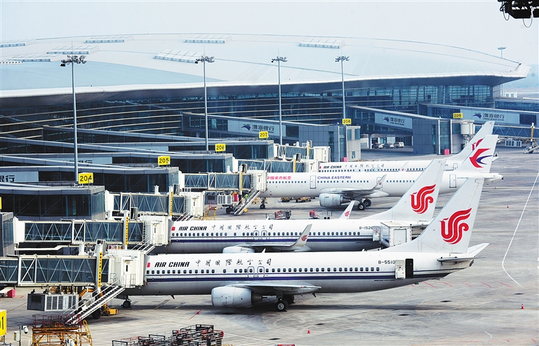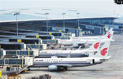 这是4月5日拍摄的在天津滨海国际机场停靠的正常起降的飞机。 4月2日至4月29日,首都机场连续28天全天关闭中跑道实施大修,由三跑道运行变为双跑道运行,调减大量航班。在首都机场中跑道大修期间,天津机场承接多家航空公司航班运行,高峰小时容量调整到32架次/小时,以接收首都机场调减下来的运力。新华社发(史淞予 摄)