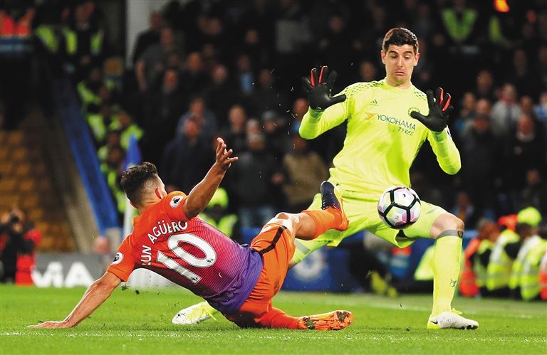 北京时间4月6日凌晨,英超第30轮上演一场强强对话,凭借阿扎尔的两粒进球,领头羊切尔西以2:1击败曼城,继续以7分优势领跑。图为切尔西守门员库尔图瓦(右)阻挡曼城球员阿圭罗的进攻。新华社发