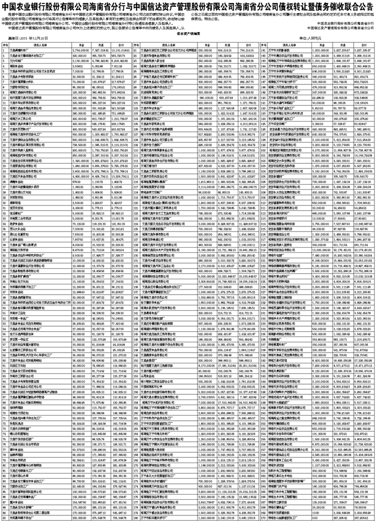 中国农业银行股份有限公司海南省分行与中国信达资产管理股份有限公司海南省分公司债权转让暨债务催收联合公告