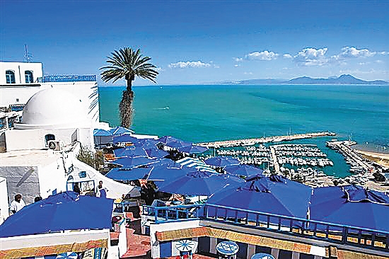突尼斯的“蓝白小镇”,位于它的首都突尼斯城的东北部,坐落在地中海边高高的峭壁之上。“蓝白小镇”所有的房屋只有两种颜色:白色的墙和蓝色的门窗、屋顶,小镇也由此而得名。简洁明快的色泽对比使得这座混合着简约和优雅的海岸小镇成为全球独一无二的绝版。它紧靠着迷人地中海,也接收着火热撒哈拉沙漠散发的巨大热量,被人认为具有“海水与火焰”的双重性格。众多画家和摄影家、背包客和追随浪漫的情侣纷纷以火焰般的热情投入它的怀抱。