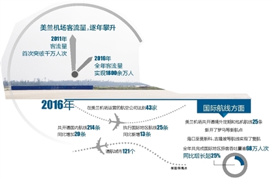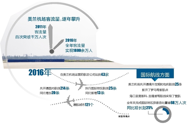 随着“一带一路”建设的加快,海南国际旅游岛建设的稳步推进,海南作为岛屿省份,其对民航运输业的需求正快速增长。如果说,十多年前的航空服务仅仅是为海南保障了基本的交通运输需求,那么今天的航空服务就是在满足基本需求的基础上,提升成为一项“享受型”的服务。海南的快速发展为本地民航事业带来机遇,美兰机场客流量逐年攀升,2011年客流量首次突破千万人次,2016年全年客流量实现1800余万人。“星级”机场服务为国际旅游岛的腾飞添动能、增新翼。