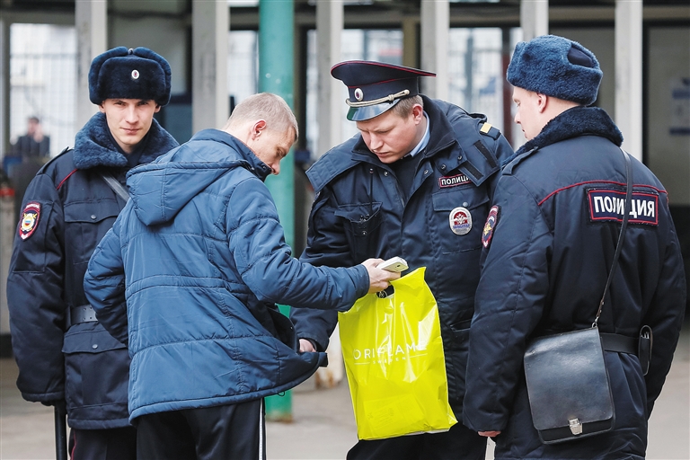 4月5日,在俄罗斯莫斯科的一个地铁站外,警察对一名行人进行安全检查。 俄罗斯总理梅德韦杰夫5日签署有关对地铁设施进行反恐防护的法令,要求组建快速反应小组,用于保障地铁设施免受“非法干扰”。 新华社/路透