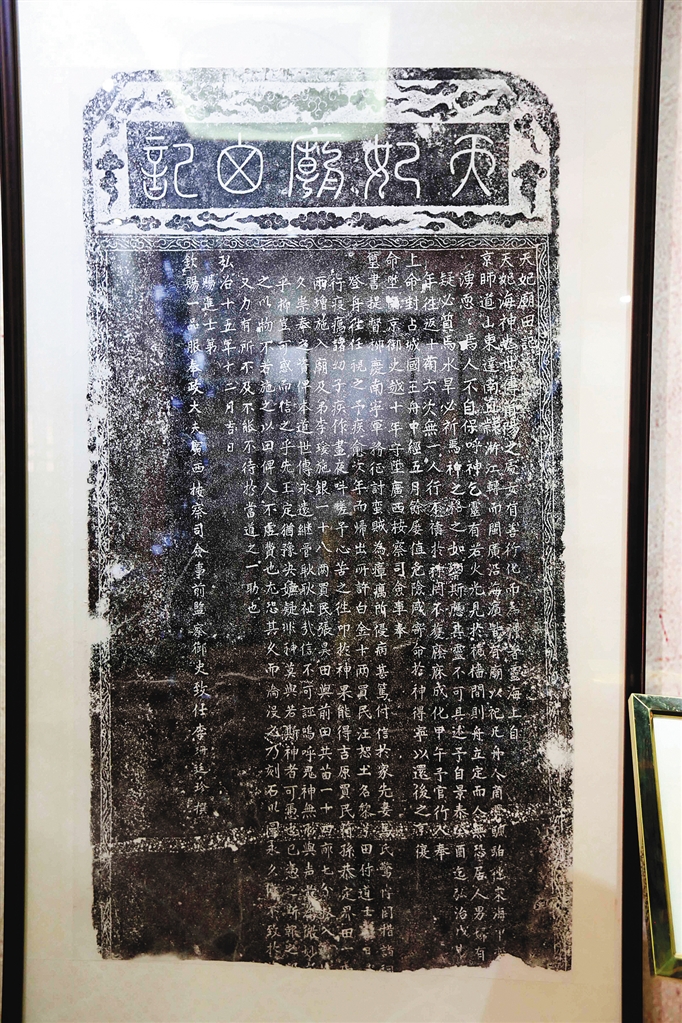 进入右边展厅,蒙文雷着重介绍了摆在最靠近门口的1米高石碑,上面用小篆清晰地刻着《天妃庙田记》。“这块完整记录天后宫历史的石碑,现在是我们的镇庙之宝。”
