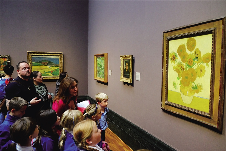 好在有导览图,还有中文语音导览器。英国国家美术馆收录了梵高、莫奈、塞尚、德加、雷诺阿、伦布朗、达芬奇、拉斐尔等名家的上千件作品。在书本上是年代数字,在美术馆内则是见画见人。穿堂过室,你会同时瞥见几幅画,脚步迟疑了,该先看哪件呢?这时,不是你在选择,而是它在夺去你的目光和神志。导览器解说内容很丰富,有点看图讲故事的感觉,如作者哪个时期创作了这个作品,这个作品的尺寸、用色、构图、光影等各个方面的特点,亦带有画家的一些故事,比如他当时的境遇让他的作品发生了什么变化。
