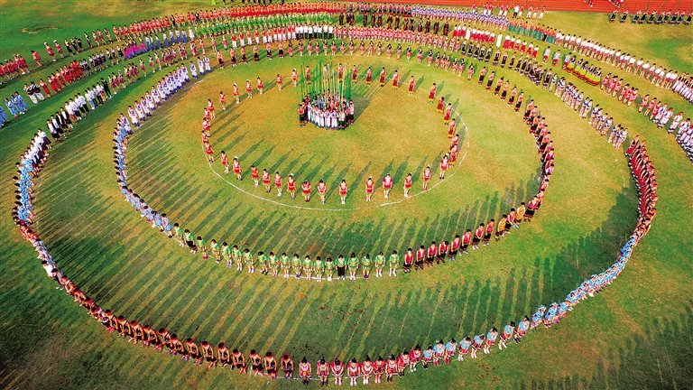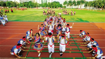 4月9日下午,海南华侨中学高中部操场,约1500名师生手拉手围成圈,集体欢跳竹竿舞,现场场面宏大,令人震撼。竹竿舞是海南传统体育、娱乐项目,深受百姓欢迎。当天举行的“千人竹竿舞”是该校在第33届传统文化节开幕前所进行的一次集体舞表演,旨在积极响应国家倡导中国传统文化进校园的号召,丰富校园文化生活,继承和发扬优秀的传统文化。本报记者 张茂 摄