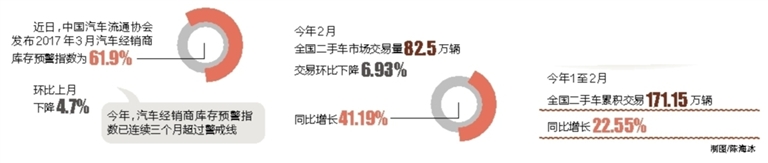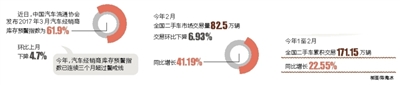 今年2月,全国二手车市场交易量82.5万辆,交易环比下降6.93%,同比增长41.19%。今年1至2月,全国二手车累积交易171.15万辆,同比增长22.55%。