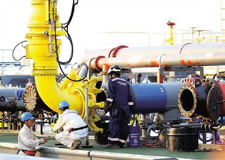 4月10日,在缅甸马德岛港,工作人员帮助卸油臂与油轮原油管口对接。 运载14万吨原油的“苏伊士”型油轮10日在缅甸马德岛港开始卸油,中缅原油管道工程宣告正式投入运行。