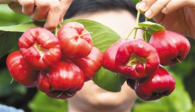 在位于海口市三江镇的莲雾基地里,黑金刚早已压弯了枝头。在海南话中,莲雾叫“点不”,最是消暑解渴的佳果。黑金刚作为从外地引进的莲雾品种,有着个大汁多味甜的特点,深红发亮的皮色,脆而细腻的果肉,都是它深受市场喜爱的原因。
