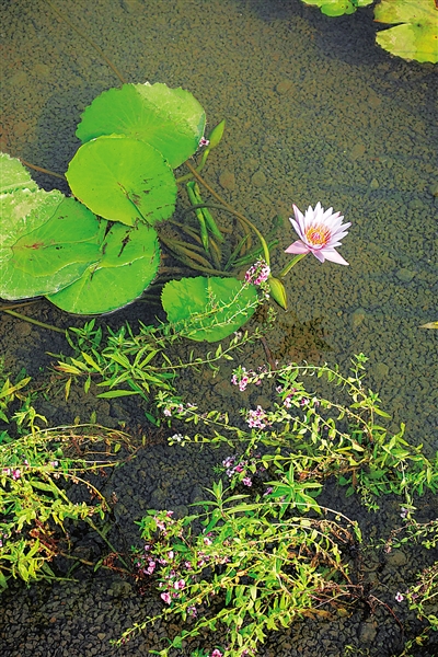 4月10日,美舍河凤翔梯田湿地试验段种植的具有净化功能的本土植物,该试验段污水经过人工湿地分级处理后已经达到净化排放标准。 本报记者 王凯 摄