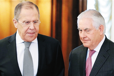 4月12日,在俄罗斯首都莫斯科,俄罗斯外交部长拉夫罗夫(左)与美国国务卿蒂勒森准备出席会谈。 12日,俄罗斯外交部长拉夫罗夫与到访的美国国务卿蒂勒森举行会谈。新华社/美联