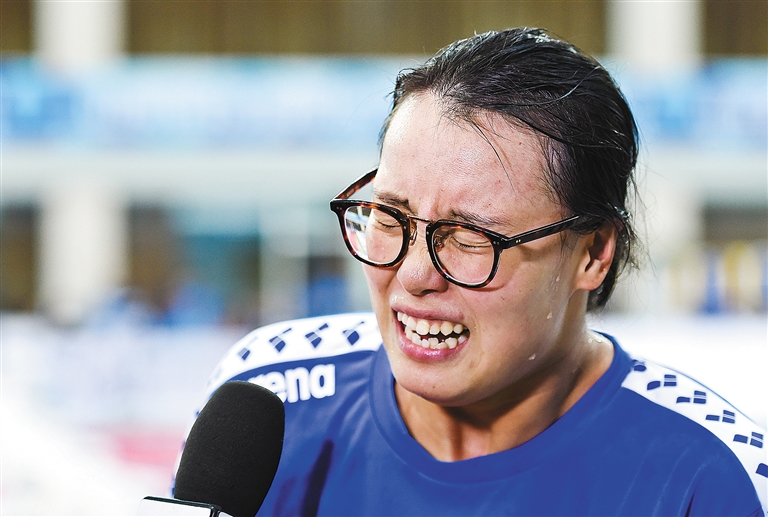 4月12日,傅园慧在2017年全国游泳冠军赛夺冠后,接受采访时腿部突然抽筋,表情痛苦。新华社发