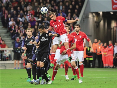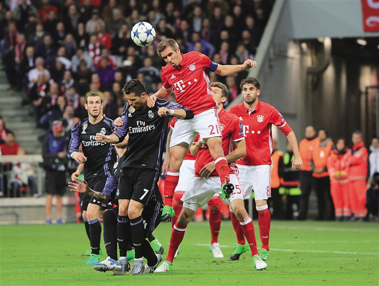 4月13日,在欧冠四分之一决赛首回合比赛中,拜仁主场以1:2不敌皇马。图为拜仁拉姆(前右)和皇马克·罗纳尔多(前左)争顶头球。