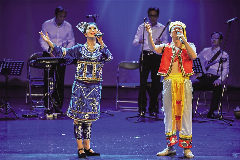 音乐会以器乐演奏结合歌舞表演的形式,上半场主要展示海南原生态民族艺术文化,包括儋州调声、黎族歌曲等。无伴奏合唱《南海摇篮曲》、神话情景舞蹈表演《鹿回头》以全新形式与生动演出,引来观众掌声阵阵。值得一提的是,在器乐合奏《南海情思》后,乐队成员还邀请观众上台互动,尝试了鼻箫演奏。