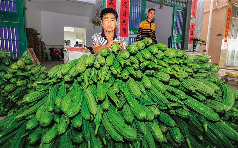 4月13日,在定安县定城镇谭黎村,村民将采摘的丝瓜打包装箱,准备运往广东、广西以及香港地区销售。据了解,去年当地政府鼓励村民种植丝瓜,全村36户贫困户,每户都得到1200株瓜苗的补贴,今年丝瓜丰收,让贫困户看到脱贫希望。