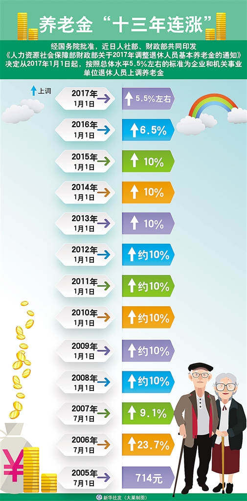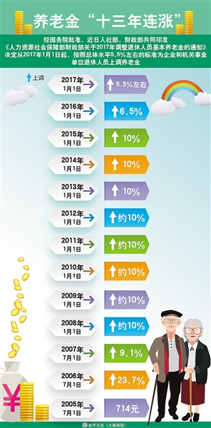 自2005年至2016年,我国已经连续12年提高企业退休人员基本养老金,使企业退休人员月人均基本养老金水平从640多元提高到2016年的2400元左右。2005年至2015年,企业退休人员基本养老金每年至少上调10%,2016年则放缓至6.5%。