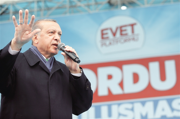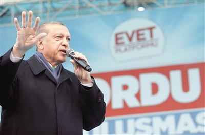 4月13日,在土耳其北部奥尔杜举行的公投造势活动上,土总统埃尔多安向支持者讲话。 土耳其将于4月16日举行修宪全民公投,就是否将国家政体从议会制改为总统制作出选择。 新华社/美联
