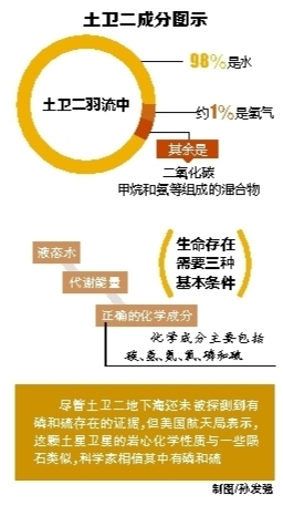生命存在需要三种基本条件,分别是液态水、代谢能量和正确的化学成分,化学成分主要包括碳、氢、氮、氧、磷和硫。尽管土卫二地下海还未被探测到有磷和硫存在的证据,但美国航天局表示,这颗土星卫星的岩心化学性质与一些陨石类似,科学家相信其中有磷和硫。