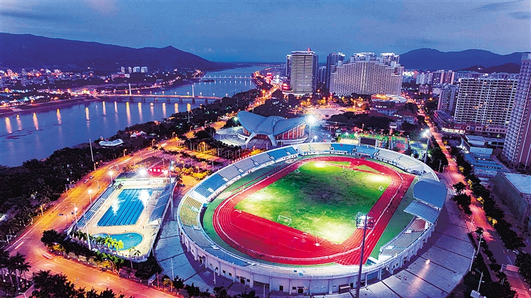 4月15日晚,陵水黎族自治县县城,陵水河两岸夜景迷人。据介绍,通过推进陵水河整治和陵水河景观廊道建设,完善球场、游泳池等休闲运动设施,陵水城市品质得到很大提升。本报记者 陈元才 通讯员 胡阳 摄