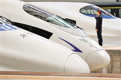 4月15日,工作人员在山东青岛火车站接发列车。 从2017年4月16日零时起,全国铁路将实行新的列车运行图,增开动车组列车25.5对。运行图调整后,全国铁路开行旅客列车总数达3615对。 新华社发(唐克 摄)