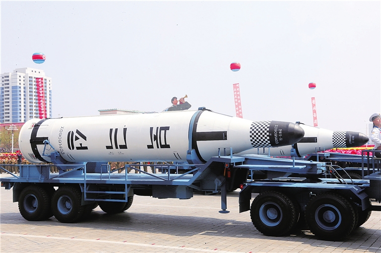 最早正式亮相于2012年“太阳节”阅兵式的KN—08型洲际弹道导弹以及两年前亮相大阅兵的KN—14型洲际导弹也登场。不过最引人注目的是一种外形类似俄罗斯“白杨—M”洲际弹道导弹的导弹。