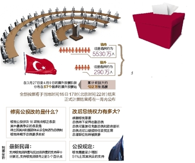 如果修宪获得通过,土耳其将从2019年总统选举和议会选举后开始正式实施总统制,自1923年建立共和国以来实行的议会制将宣告结束。