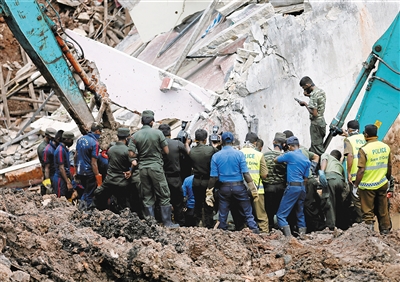 4月16日,在斯里兰卡科伦坡,人们参加救援行动。 斯里兰卡首都科伦坡14日晚发生的垃圾山坍塌事件死亡人数已增至20人,其中包括5名儿童,另有近180人受伤。 新华社/路透