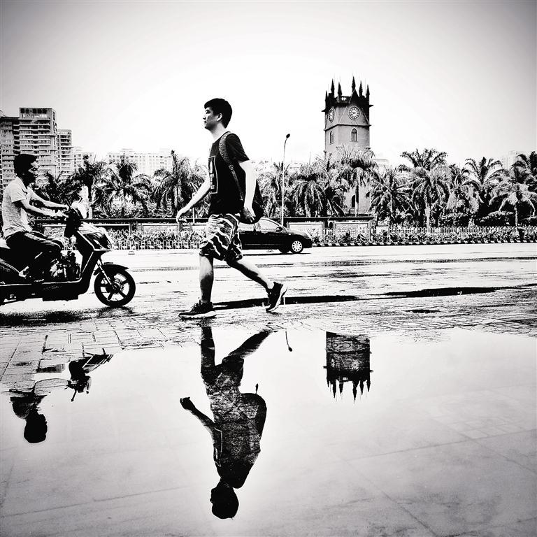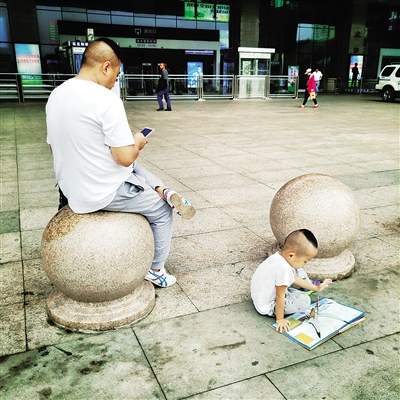走过海口动车东站,孔祥标看到一对“默契十足”的大人和孩子正在车站前的广场候车。他们身着同样的白色T恤衫,灰色运动裤,剃着一样的“莫西干头”。大人坐在画面左侧的路障石球上玩手机,孩子坐在画面右侧的地板上,津津有味地看画册。孔祥标在旁举起手机,不动声色地按下拍摄键,记下了这一个富有情趣的画面。