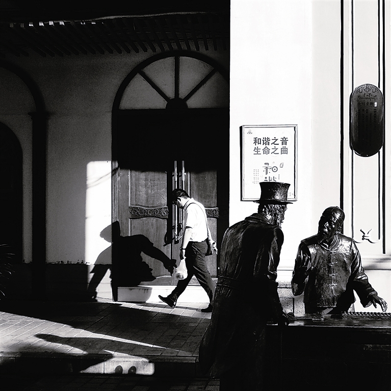 光影能给城市的老街赋予别样的格调。孔祥标了解太阳在这座城市的投影规则,以敏锐的目光捕捉纪录光线变化的瞬间。又是在骑楼,阳光穿射巷弄遗留明亮光幕。一个低垂着头的上班族拿着早餐匆匆走过,留给手机镜头一个若有所思的背影。画面近景处,两个被雕塑成对话姿态的铜人,仿佛窃窃私语,不知是否在为青年的行色匆匆而感叹。