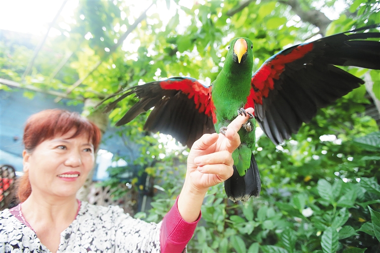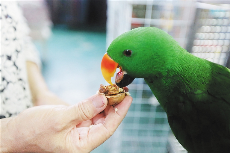 站在鸟笼前,董阿姨把手一伸,一只雄性折衷鹦鹉竟迈开灰色的小脚径直往她手上爬,不一会便顺着手臂爬上了她的肩膀。