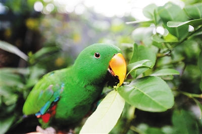 站在董阿姨肩头,鹦鹉张着一双黑黑的小眼睛机警地左顾右盼,黄橘色渐变的钩状喙不时磨蹭她的耳朵,一身油亮的草绿色羽毛光鲜亮丽,翅膀底下衬着五彩缤纷的长羽,长尾巴高高翘起,漂亮又神气。