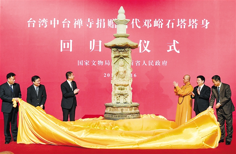 4月16日,在山西博物院,出席回归仪式的嘉宾共同为邓峪石塔揭幕。 当日,台湾中台禅寺捐赠唐代邓峪石塔塔身回归仪式在山西博物院举行。被盗流失19载的这一珍贵文物终于“回家”了。 新华社记者 李贺 摄