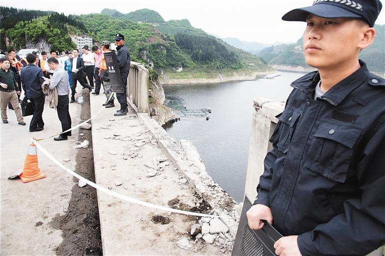 4月17日,工作人员在事故现场警戒。 4月17日上午,一辆由贵州省贵阳市开阳县发往黔南州瓮安县的19座客车在开阳县发生交通事故坠河,目前已造成10人死亡。 新华社发