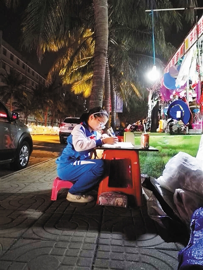 每晚走过海南大学海甸校区南门夜市,很多人会发现一个安静地在绿化带上吃晚饭、写作业的女孩。她叫小惠,是海口市三十一小学生。“因为妈妈要摆摊,我就每天来这里写作业、吃晚饭,陪着妈妈,十点多钟舅舅再把我接回家去。”小惠说,她也习惯了陪着妈妈做生意,只有下雨天才不来夜市。提起学习成绩,小惠害羞地低下头:“不太好,还要再努力!”